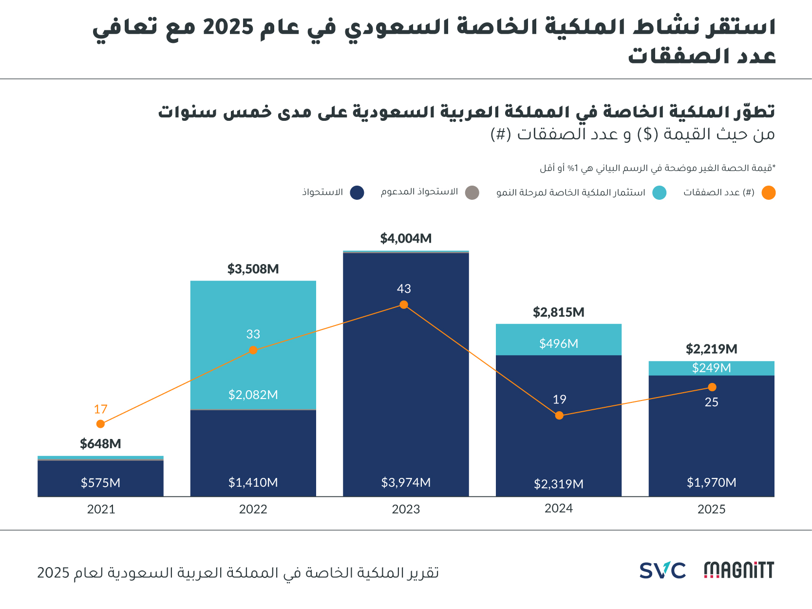 يُقدم هذا التقرير المجاني، الذي أعدته MAGNiTT بالتعاون مع SVC، دراسة لكيفية تطور سوق الملكية الخاصة في المملكة العربية السعودية في عام 2025، كاشفاً عن تحولات في تكوين الصفقات، وتركّز رأس المال، ونشاط القطاعات، ومشاركة المستثمرين، مما يشير إلى المسار طويل الأجل للسوق.