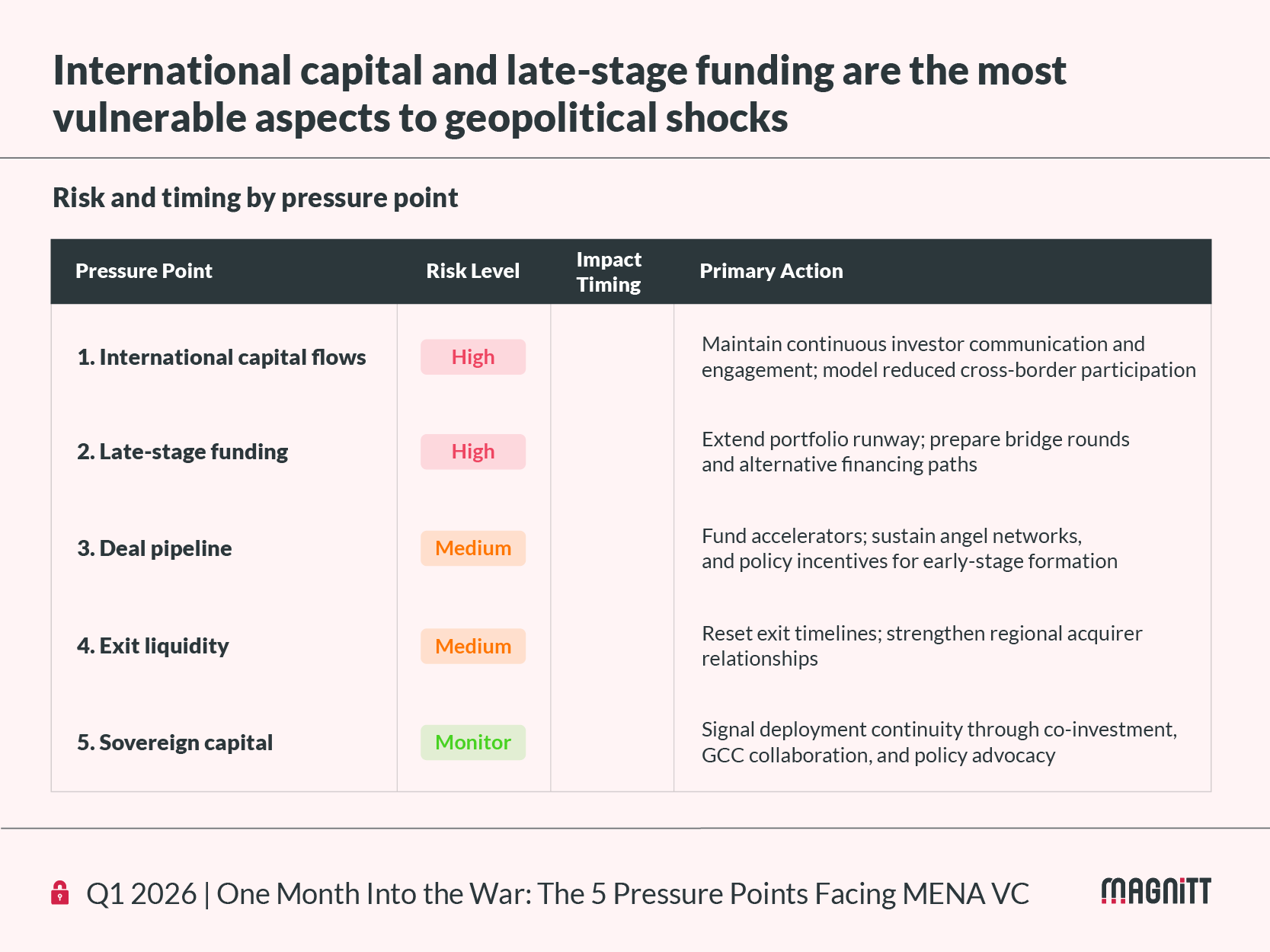 For investors, founders, and policymakers, understanding these transmission channels provides an early warning system for how the current conflict could reshape capital flows, funding availability, and exit activity across the MENA venture ecosystem.