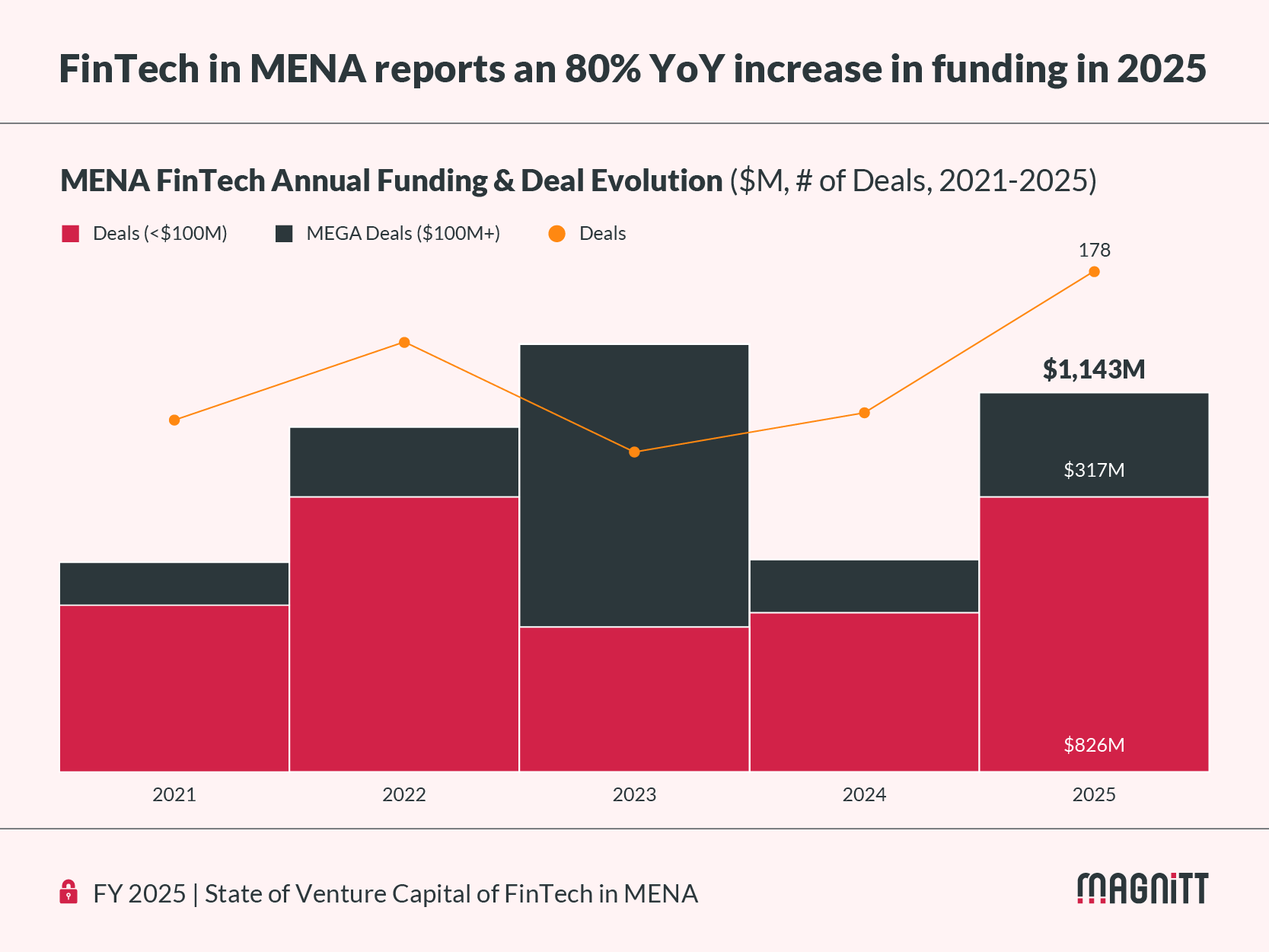 FinTech accounted for 26% of all MENA deals in 2025, the highest share on record, recording a 39% YoY increase in deal count and 80% in funding.Â